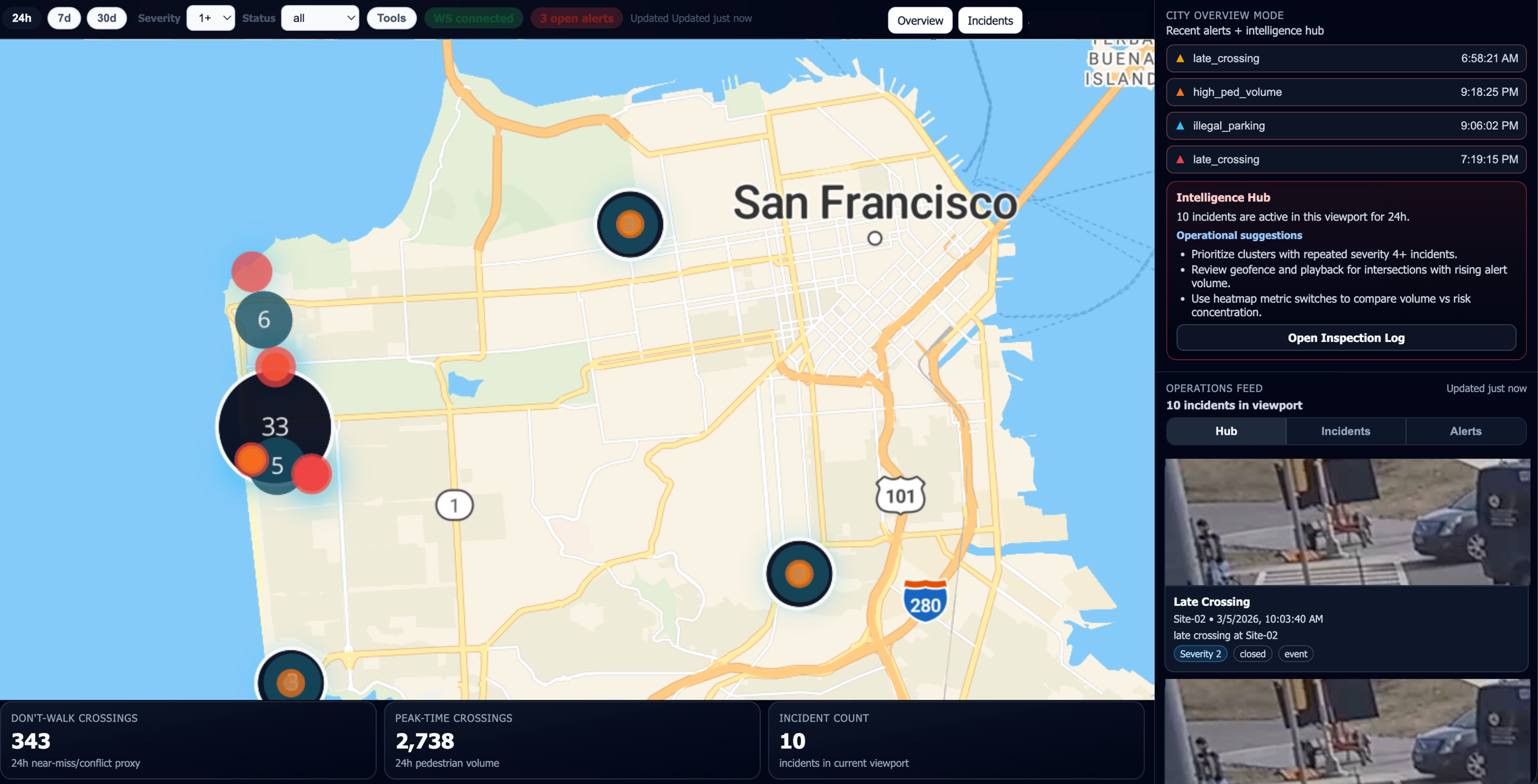 Cumulant’s Automated Pedestrian Safety Agent is a city-ready system that continuously measures pedestrian activity and safety conditions - without adding operational burden to staff. It automates data collection, delivers a live dashboard, and applies AI-driven analysis to surface risk patterns, trends, and before/after program impact. Results are visualized through map-based GIS views and intuitive reporting so teams can validate interventions, prioritize improvements, and act faster with confidence.